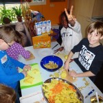 Kartoffeln, auch Süßkartoffeln, und Äpfel stehen im Mittelpunkt. „Wir machen Pommes, Chips und Kartoffelbrei, heute Nachmittag noch ein Apfelmus“, sagt Corinna Weimer. Zu den Kartoffelspezialitäten wird beim Mittagessen ein Dipp und jede Menge Rohkost gereicht. Wer möchte, bekommt ein Würstchen. Eifrig schnippeln die Kinder Karotten, Gurken, Tomaten und Paprika. Zwischendurch wandert auch das eine oder andere Stück in den Mund. Das eigenhändige Zubereiten der Mahlzeit sorgt für zufriedene und entspannte Gesichter.