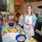 „Ich helfe zuhause auch immer beim Kochen. Am liebsten mache ich Tiramisu“, erzählt Youmilyne (8) und der neunjährige Nils wirft ein: „Kochen finde ich richtig schön.“ „Die meisten Kinder wissen schon einiges über gesunde Ernährung“, sagt Corinna Weimer, die zu Beginn der Veranstaltung mit den kleinen Teilnehmern die Ernährungspyramide und ihre Bestandteile besprochen hat. Welche Gruppen von Lebensmitteln gibt es und wovon sollte man wie viel essen?