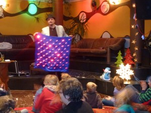 Nikolaus kommt winkend auf einem Mofa