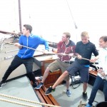 Wenige Stunden nach dem Aufstehen einiger Teilnehmer hatten wir schon die Insel Texel erreicht. Für diese Insel stand ein weiterer großer Programmpunkt auf dem Plan: Eine Radtour quer über die Insel, die die Stationen „Ecomare“ und Pfannkuchenhaus beinhaltete, sollte uns den ganzen Tag über beschäftigen. Das erste Etappenziel war das „Ecomare“, das wir bei ständigem Gegenwind nach ca. einer Stunde erreichten. Pünktlich zur Seehundfütterung erreichten wir das „Zentrum für Wattenmeer und Nordsee“, so dass alle Teilnehmer auch direkt noch etwas Besonderes geboten bekamen. Das „Ecomare“, so lernten wir es, ist auch eine Seehund- und Tierauffangstation für alle möglichen Tiere des Meeres, die verletzt oder verstoßen gefunden wurden. Am späten Nachmittag machten wir uns schließlich noch mit dem Rad auf den Weg zum Pfannkuchenhaus. Tolle Pfannkuchen-Varianten mit Eis oder frischen Erdbeeren oder auch herzhaft mit Käse und Speck – ein leckerer Preis! Wieder zurück am Schiff, beschlossen die Betreuer, dass wir Jugendlichen noch ein wenig Freizeit haben sollten und verlegten die Besprechung kurzerhand auf das morgige Frühstück. Alle „Matrosen“ waren erfreut über die Nachricht und verflüchtigen sich direkt in Richtung Bolzplatz oder Hafendusche. Auch die Betreuer genossen nun einen verdienten und vor allem entspannten (Feier-) Abend. Ein abendlicher Film, mit dem Videobeamer auf ein Segel des Nachbarschiffes geworfen, rundete den schönen Abend ab.