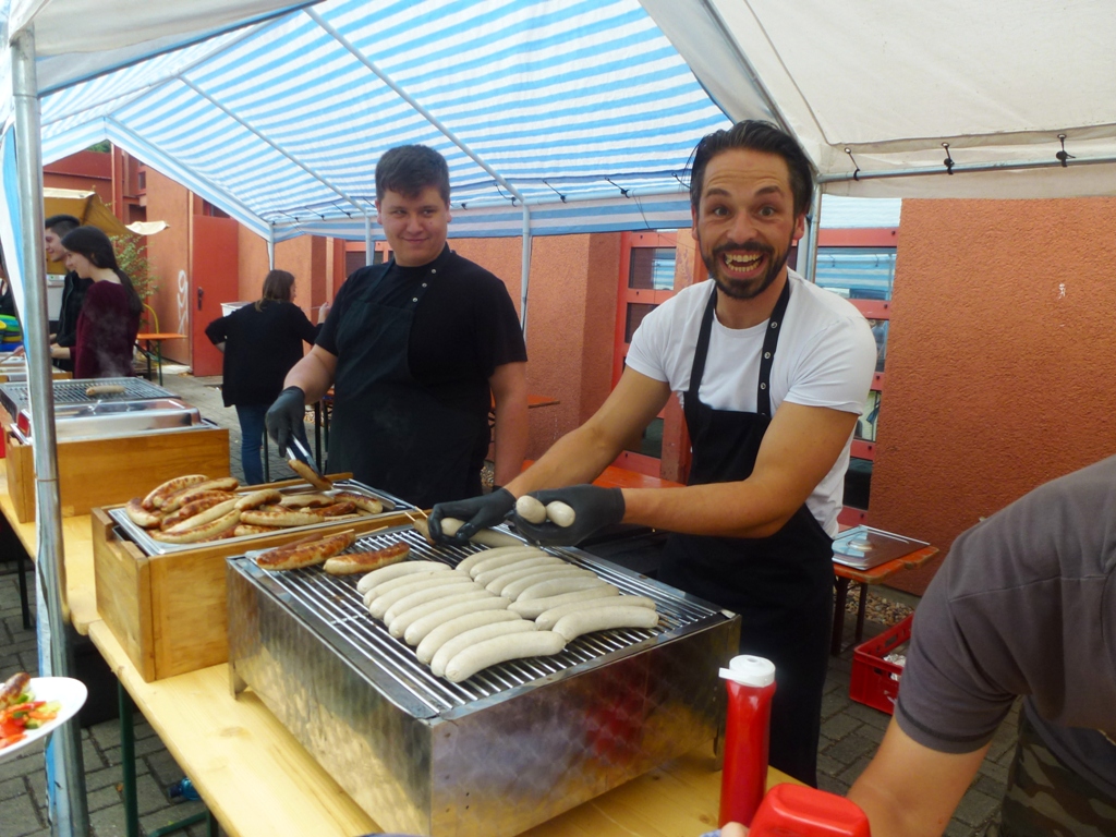 Auch die aufgestellten Bierbänke waren rasch gefüllt und am Stand der SG Rot-Weiss Babenhausen, die wie jedes Jahr Bratwurst und Pommes verkauften, bildeten sich lange Schlangen. Kaum enden wollte auch der Ansturm auf die kleinen Pizzen, die das Restaurant „Schwartzer Löwe“ erstmals in das Ferienspiele-Fest-Menü einbrachte. „Das ist hier ja wie auf dem Volksfest“, sagte 1. Stadtrat Kurt Lambert, der den urlaubenden Bürgermeister vertrat und das Fest zum Anlass nahm, sich bei allen beteiligten Vereinen zu bedanken – allen voran beim TSV Harreshausen, der sein Gelände und Spielmaterialien zur Verfügung gestellt hatte.