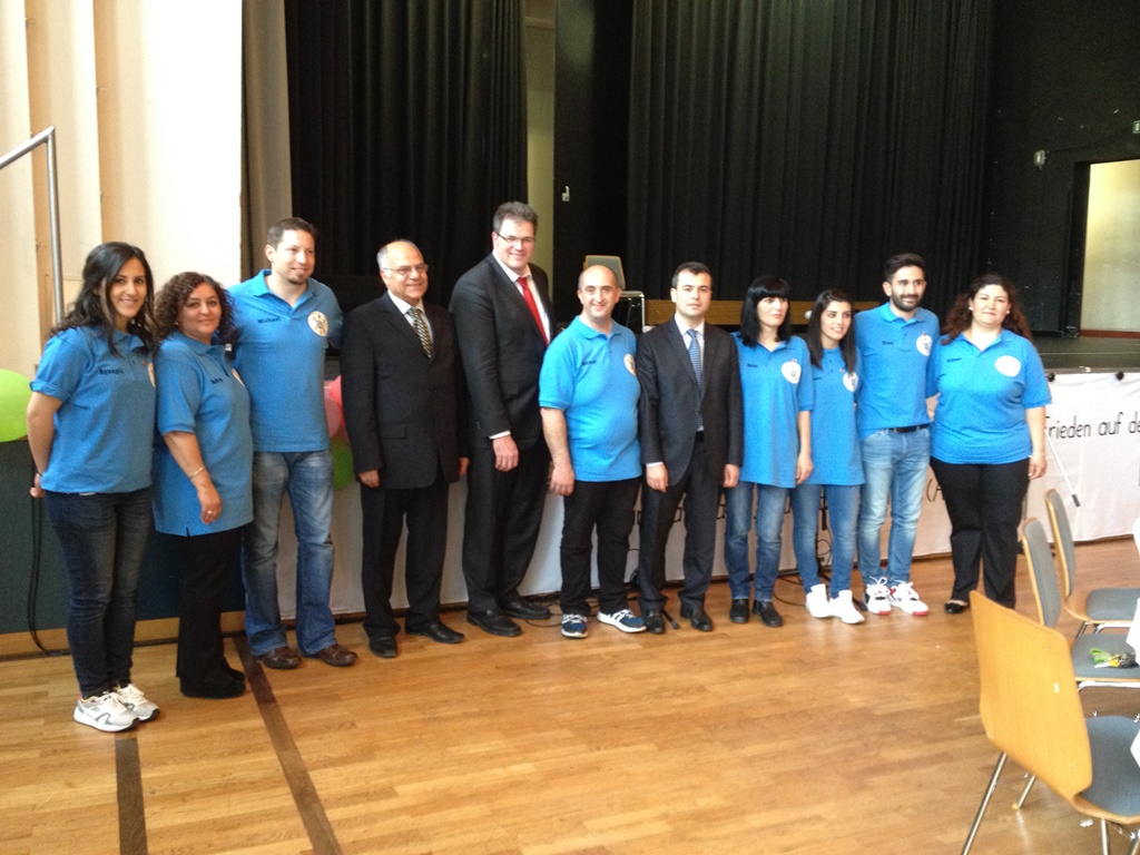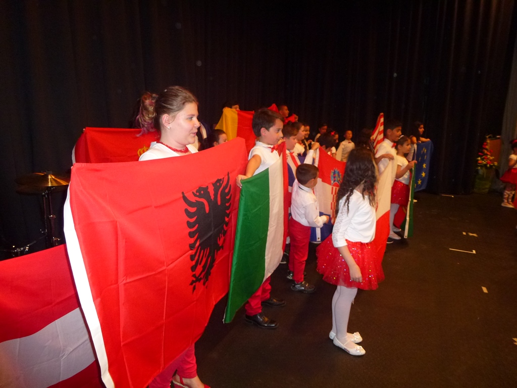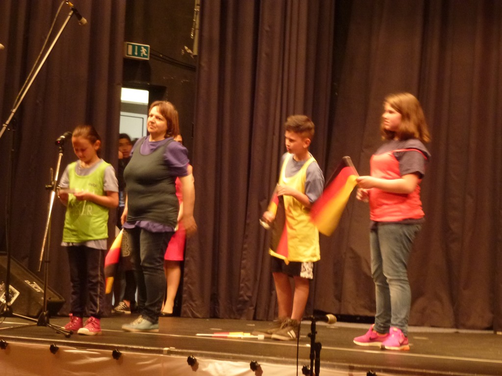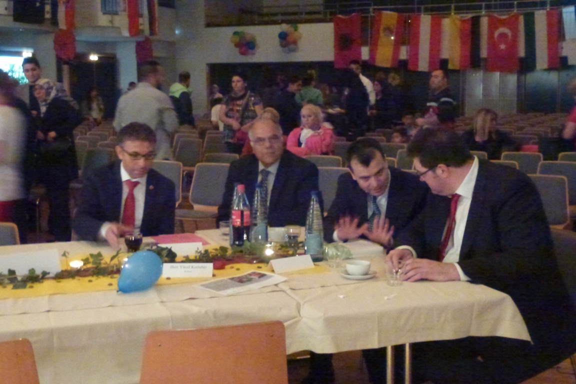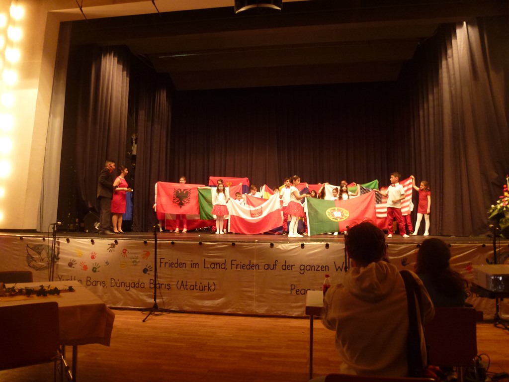 Die Resonanz konnte sich sehen lassen: Für 500 Personen wurde bestuhlt, 400 kamen. Im Mittelpunkt stand ein Bühnenprogramm mit Tanz, Akrobatik, Gesang und weiteren Vorführungen. Vorrangig Eltern aus dem Erloch hatten sich monatelang in der Vorbereitung engagiert und den Ausrichter, die Kinder- und Jugendförderung, unterstützt. Da vor allem türkische Eltern involviert waren, wurde auf deutsch und türkisch moderiert. Das übernahmen Aysenur Dogan (12) und Göktan Arikan (14). Mit schwarzem Anzug und roter Fliege sowie rotem Kleid präsentierten sich beide in Gala-Manier. Unter der Bühne zog sich auf einem Zehn-Meter-Banner die Aussage des Gründers der modernen Türkei Mustafa Kemal Atatürk: „Frieden im Land – Frieden auf der ganzen Welt.“