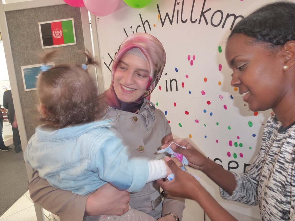 Der Weg zum internationalen Kinderfest in der Stadthalle führt im Foyer an Karen Burkholder vorbei. Die Mitarbeiterin der Kinder- und Jugendförderung erhebt dort überraschend Eintritt. Der ist aber nicht finanzieller Art: Es ist ein Fingerabdruck, der nach dem Eintauchen in roter, blauer, gelber oder grüner Farbe auf ein Plakat mit der Überschrift „Willkommen in Babenhausen“ gesetzt wird. Schon nach kurzer Zeit entsteht damit ein buntes Bekenntnis individueller Prägung. „Das ist unser ganz spezieller Gruß an Flüchtlingskinder. Jeder ist in der Stadt willkommen“, erzählt Burkholder. Dafür sprechen auch die acht Fahnen am Plakatrand: Unter anderem mit Syrien, Irak, Afghanistan oder Somalia sind es jene Länder, aus denen derzeit die meisten Flüchtlinge nach Babenhausen kommen.