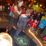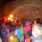 „Ist das ein verspäteter Martinsumzug? Das mögen einige aufgrund der vielen Lichter und Kinder gedacht haben, die am Freitagabend durchs Zentrum zogen. Doch handelte es sich um die Nikolaus-Wanderung der städtischen Kinder- und Jugendförderung. Viele brachten Taschenlampen mit, dazu wurden 40 bis 50 Fackeln verteilt. Als Krönung wartete am Hexenturm der Mann mit dem roten Mantel und dem Rauschebart. Als sich die Teilnehmer kurz nach Einbruch der Dunkelheit am Jugendzentrum versammelten, traute Jugendpfleger Michael Spiehl seinen Augen nicht: Mit rund 100 Kindern und Eltern kamen so viele Interessierte wie noch nie in der vierjährigen Geschichte der Veranstaltung. Zur Einstimmung wurden sie mit Musik, Kinderpunsch, Glühwein, Brezeln und heißen Würstchen empfangen. Romantisch loderten mehrere Feuerschalen, die zum Stockbrotbacken einluden. Die vielen Treppenstufen am Schachbrett an der Stadthalle wurden zum Spielen und Tollen genutzt. War im letzten Jahr noch im Keller des Jugendzentrums ein zusätzliches Programm mit Zaubern und Vorlesen geboten, verzichteten die Verantwortlichen diesmal darauf. „Wenn drinnen und draußen was geboten wird, dann wird die Veranstaltung zu sehr auseinander gerissen“, erklärte Spiehl. Mit der Wanderung als Basis setzte man komplett auf „open-air“. Gleich zu Beginn begrüßte die Band der Grundschule im Kirchgarten die Gäste. Die AG kooperiert mit der Kinder- und Jugendförderung und nutzt die Räumlichkeiten und Instrumente des Jugendzentrums. Der Nikolausumzug bot ein prächtiges Bild, auch wenn die Feuer vielen Eltern eine verstärkte Aufmerksamkeit abverlangte: „Pass auf deine Mütze auf. Halt die Fackel weiter weg“, war nicht nur einmal zu hören. Am Hexenturm wartete mit KiJuFö-Mitarbeiter Günther Titz Knecht Rupprecht. Zur Überraschung spielte er Gitarre und sang „Kling Glöckchen Kling“, bevor er kleine Gaben verteilte. Danach ging’s weiter zum Jugendzentrum zurück, wo der Nikolausabend keineswegs vorbei war: Mit einer schönen Feuershow wurde die Dunkelheit erneut vertrieben.“