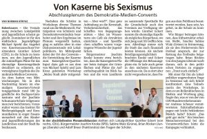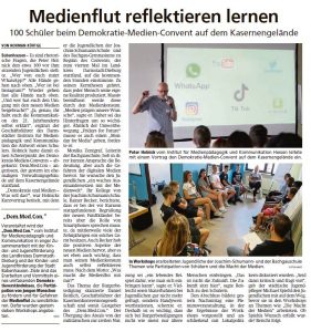 Die Verzahnung zwischen Lokalpolitik und Jugendlichen scheint geglückt. Zumindest ist für den städtischen Jugendpfleger Michael Spiehl das Angebot von Kasernenausschuss-Vorsitzendem Günther Eckert (CDU), in die Schule zu kommen, um den Jugendlichen die zukünftigen Pläne für das ehemalige Kasernengelände detailliert zu erläutern, ein vorzeigbares Ergebnis des Demokratie-Medien-Convents. An dem hatten von Mittwochmorgen bis in den Nachmittag hinein im ehemaligen Kasernen-Verwaltungsgebäude rund 100 Jugendliche des Bachgau-Gymnasiums und der Joachim-Schumann-Schule teilgenommen. Veranstalter waren das Institut für Medienpädagogik und Kommunikation in enger Zusammenarbeit mit den Kinder-und Jugendförderungen des Landkreises und der Stadt Babenhausen.